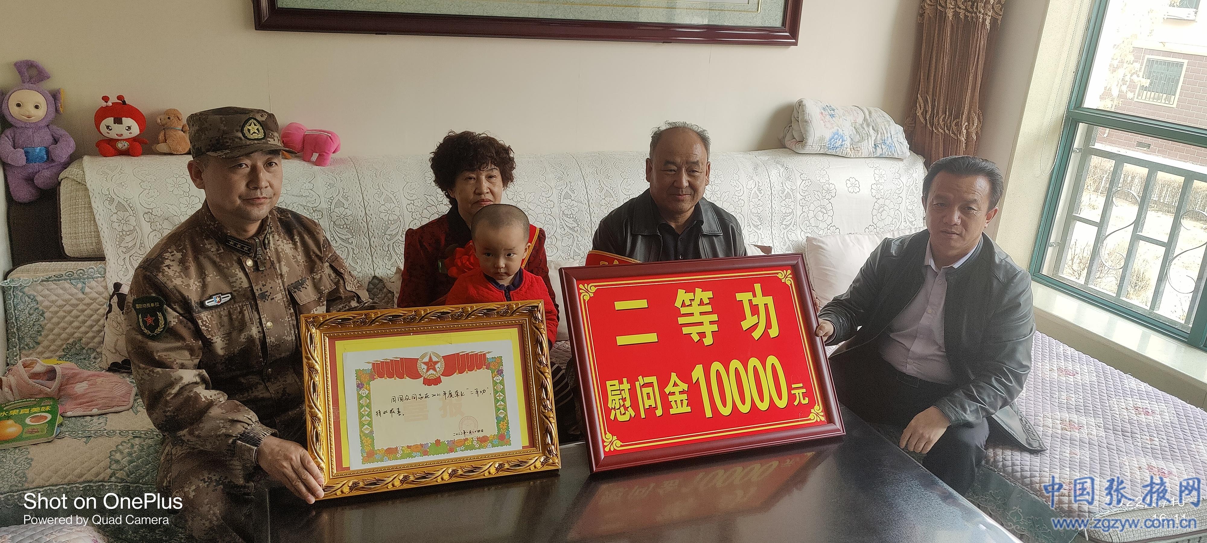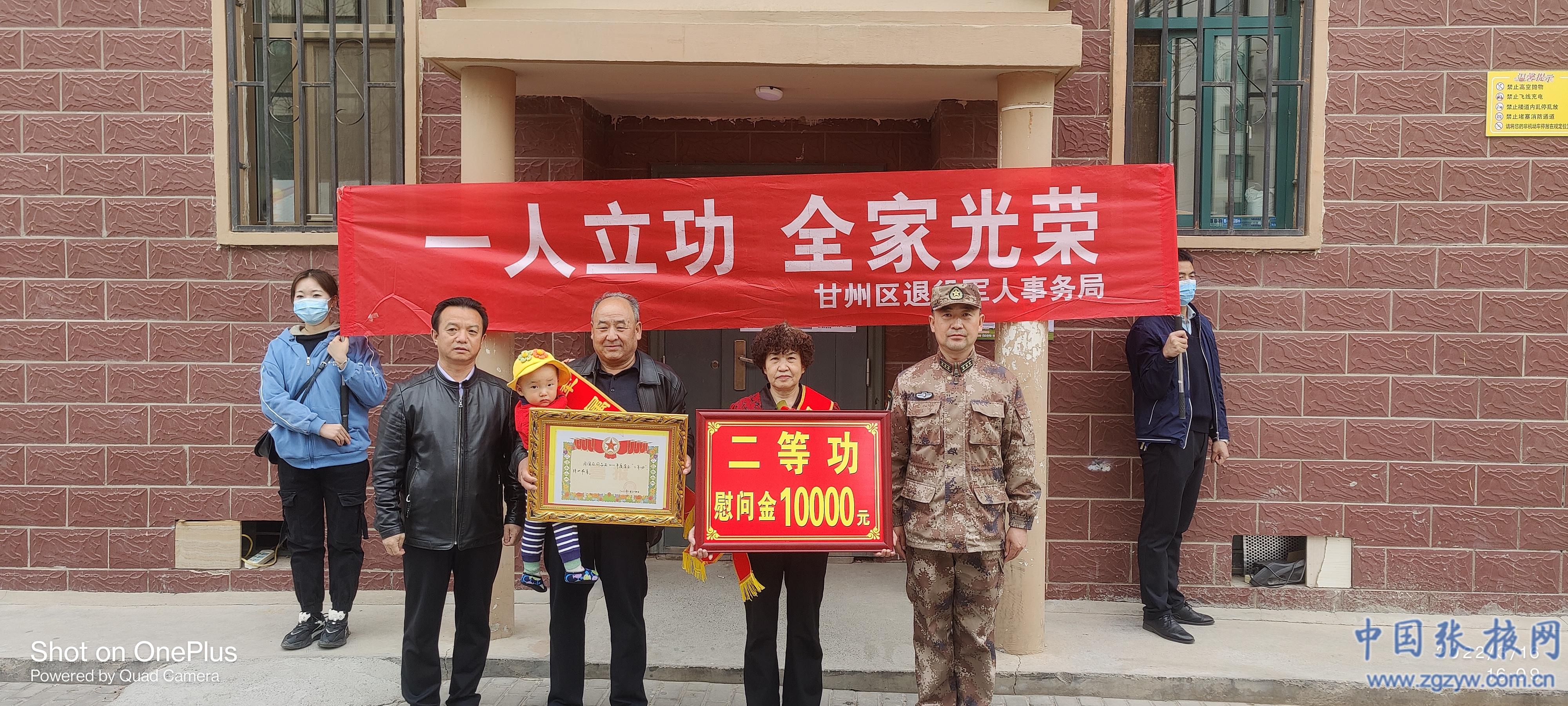 中國張掖網(wǎng)訊 一人立功,全家光榮!3月16日,張掖市甘州區(qū)退役軍人事務(wù)局、人武部主要負(fù)責(zé)人及西街街道相關(guān)負(fù)責(zé)同志,來到寧和園A區(qū)周國眾家中,為家屬送來立功喜報(bào)和慰問金,并為家屬佩戴光榮綬帶。