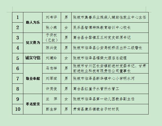 根據省委宣傳部、省文明辦等部門聯合下發《關于組織開展第八屆甘肅省道德模范評選表彰活動的通知》(甘文明辦〔2022〕18號)要求,經縣區和市直部門單位推薦上報,活動組委會擇優評選,現將張掖市推薦參評第八屆甘肅省道德模范候選人予以公示,廣泛聽取社會各界意見,接受廣大群眾監督。如有意見和建議,可通過信函、郵件、電話等方式從公示之日起向張掖市文明辦反映。