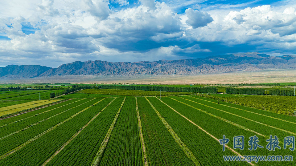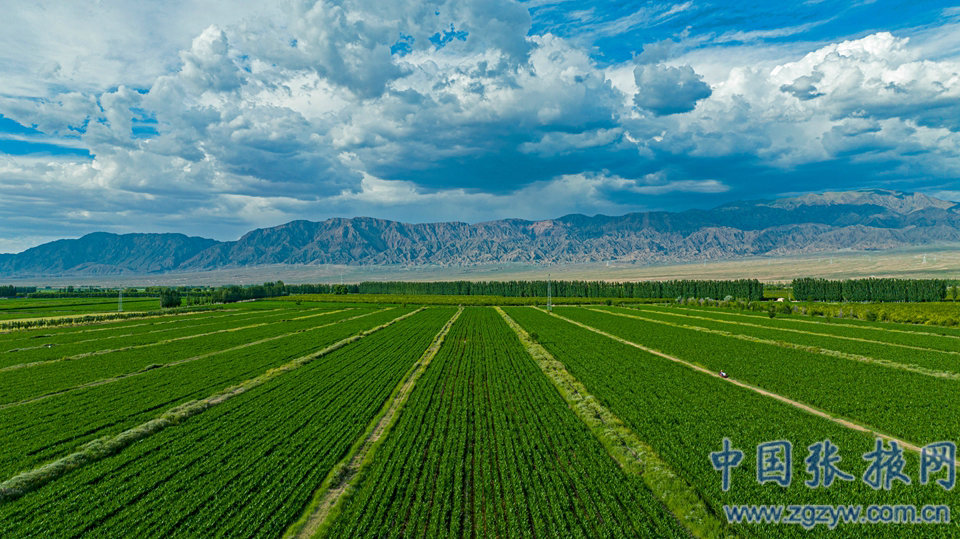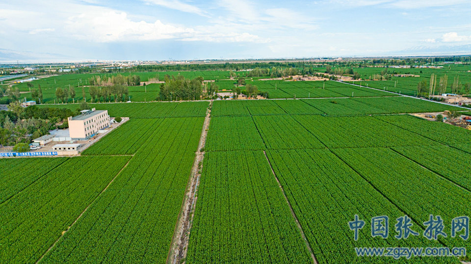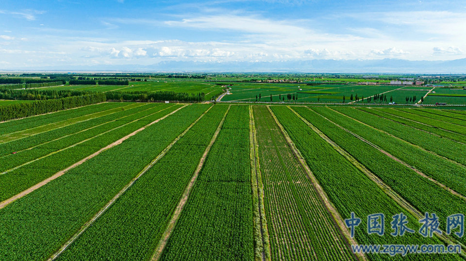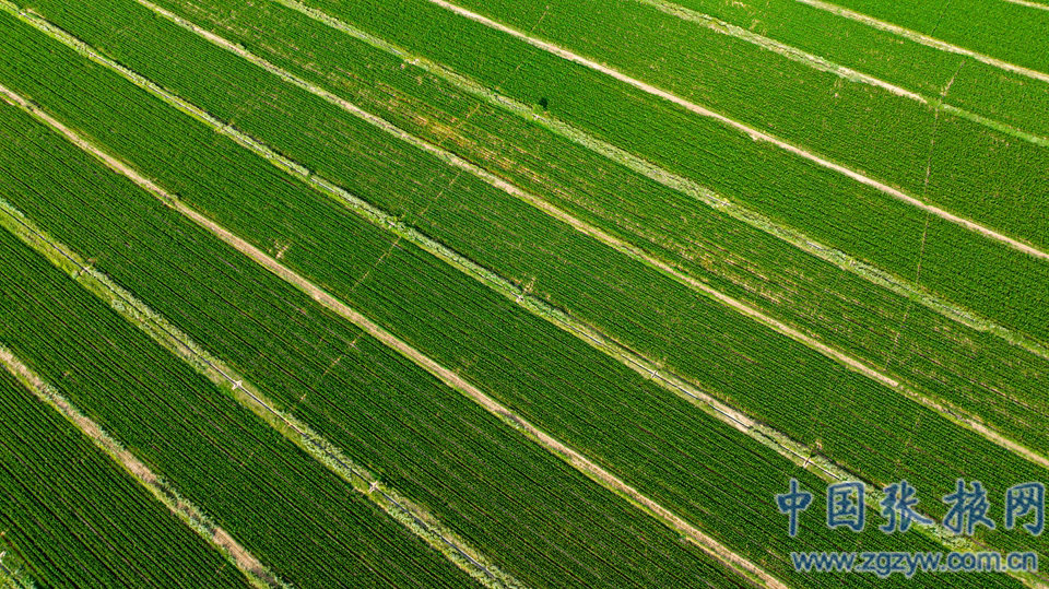 6月27日,張掖市甘州區大面積制種玉米生長茂盛,田野阡陌縱橫交錯,與藍天白云構成了一幅秀美的田園景色。(特約攝影師 成林)
