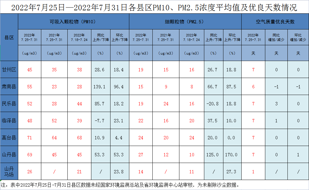 張掖市各縣區空氣質量周報