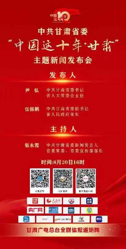 預告!中共甘肅省委“中國這十年·甘肅”主題新聞發布會將于8月20日舉行