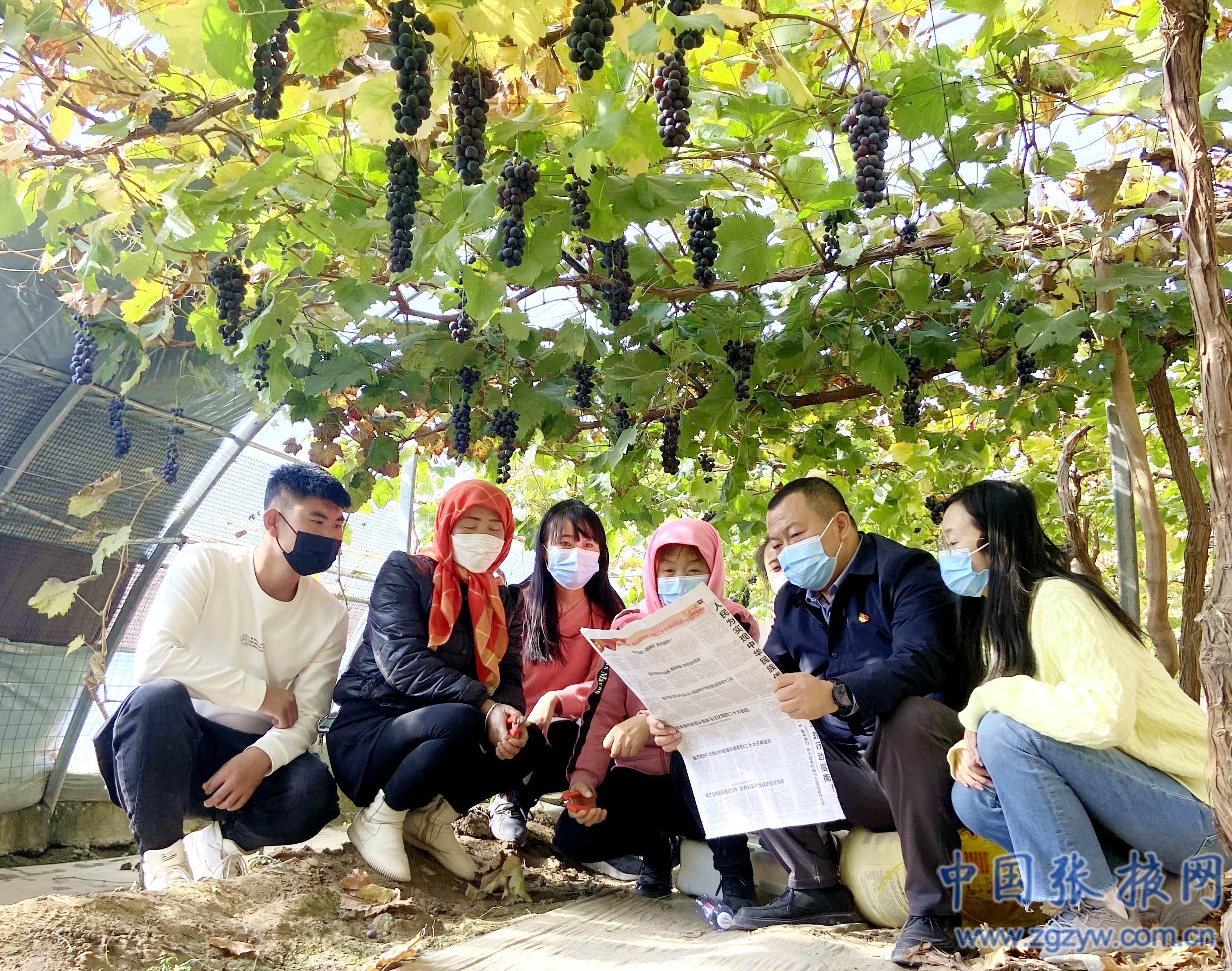 中國張掖網甘州訊 “黨的二十大報告中提出,要‘全面推進鄉村振興。堅持農業農村優先發展,堅持城鄉融合發展,暢通城鄉要素流動。扎實推動鄉村產業、人才、文化、生態、組織振興。’我們要依托現有的高端品系葡萄產業發展基礎,進一步延伸紅色產業鏈條,持續放大農旅產品品牌效應,努力推動全村在新的趕考之路上實現更高質量發展。”11月1日上午,甘州區龍渠鄉副鄉長張森同志在墩源村葡萄產業園里,用鮮活的故事、生動的例子、接地氣的話語為群眾宣講黨的二十大精神。