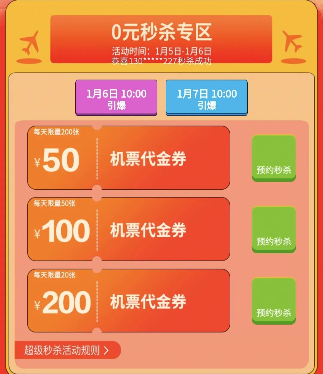 參加活動旅客可通過同程旅行微信小程序進入活動界面搶購優惠券,優惠券使用期限為2023年1月7日-2023年1月9日,適用蘭州、敦煌、慶陽、金昌、隴南、嘉峪關、張掖春運期間(1月7日-2月15日)的所有進出港航班。