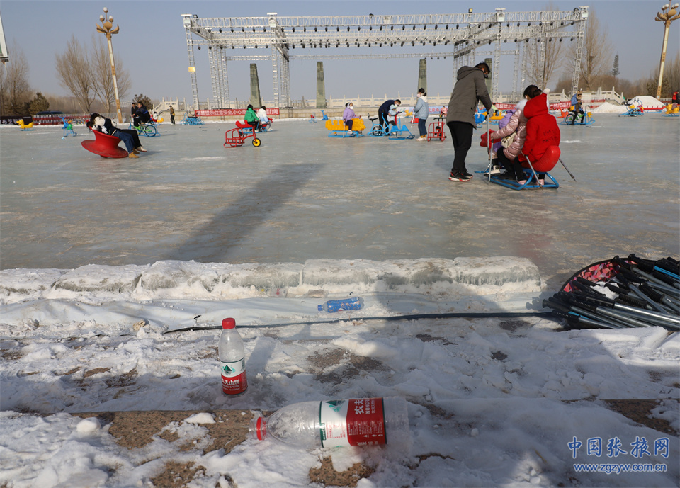 甘州區(qū)濱湖廣場滑雪場環(huán)境干凈整潔,游客有序欣賞美景、快樂游玩,附近地面和冰面上有一些垃圾,格外顯眼。