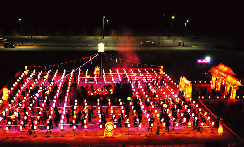 高臺(tái)黃河燈陣全稱為“九宮八卦黃河陣”,又叫“九曲黃河陣”或“燈桿會(huì)”。自明清以來,高臺(tái)縣較大的堡子每年正月十三到正月十六都有黃河燈陣,主要是為了當(dāng)?shù)匕傩涨蠹榍笃桨玻耐忻篮米T浮恼率蝗站烷_始著手準(zhǔn)備,并且這一天在燈場(chǎng)中心立一根高8米的木柱,稱之為“立大桅”。在“大桅”的頂端高掛“混元金斗”燈,掛一塊6.4米長(zhǎng)的黃布,稱“杏黃大旗”,在大桅下面設(shè)置中央祭臺(tái),擺放趙公明(財(cái)神爺)畫像或塑像,放置香爐、香表之類,擺一功德箱,設(shè)一中堂,有燈官坐堂,兩班衙役(當(dāng)?shù)厝罕姲缪?跟隨,人們?cè)诖似砬笮腋0部怠⑽骞蓉S登。在祈福時(shí),要跪拜燈官老爺,燈官老爺口念祝頌語,賜福于跪拜者;然后由兩班衙役手持水火棍在跪拜者身上輕輕擊打,同齡熟人之間故意打得較重,以逗笑取樂,同時(shí)口念“一打國(guó)泰民安,二打風(fēng)調(diào)雨順,三打長(zhǎng)命百歲,四打大吉大利”等祝福語。正月十三晚上,在大桅四周按21行、21列呈正方形栽植木桿,并拔去中央9個(gè),以留出中央祭臺(tái)的位置,木桿高1.2米,共432根,行距、株距視場(chǎng)地大小而定,用繩子將這些木桿連接起來,繩上粘貼彩紙小旗,形成一個(gè)迷宮般的燈陣。每個(gè)木桿頂端放一塊20厘米見方的小木板,小木板四周糊上15厘米寬的一圈彩紙,再貼上各種窗花圖案,叫作燈帽子。在燈帽子中心放一盞由面粉捏成的小油燈,添上清油,放上捻子。一般燈桿、燈帽、面燈都是本村老百姓自發(fā)捐來的,面燈都是蒸熟的。關(guān)于點(diǎn)花燈,還有一些傳統(tǒng),即“正月十三是白燈,正月十四半場(chǎng)子燈,十五、十六是全燈”。具體做法是:正月十三晚上,只點(diǎn)燃中間大桅上的主燈和四角木柱上的幾盞燈;正月十四晚上,點(diǎn)燃中央主燈和八個(gè)方位上的一部分燈;正月十五、十六晚上點(diǎn)燃所有的燈。四角四燈柱高掛燈串,四周全用紅燈圍起,不得隨意入內(nèi),每陣中央設(shè)置黃色燈籠提示游人慢行。目前,高臺(tái)黃河燈陣主要在黑泉鄉(xiāng)鎮(zhèn)江村沿襲傳承。此外,合黎鄉(xiāng)五三村也有“卍”字燈陣,布陣方法有所不同,在四角及中央的木柱上分別書寫“東方甲乙木星之神位、南方丙丁火星之神位、中央戊己土星之神位、西方庚辛金星之神位、北方壬癸水星之神位”。在該縣黑泉鄉(xiāng)定平村(原稱大寧堡)堡內(nèi)西北角原有一“燈架灣”,中立大桅常年不撤,因而得名。 2011年3月16日,高臺(tái)黃河燈陣被甘肅省人民政府列入第三批甘肅省非物質(zhì)文化遺產(chǎn)代表性項(xiàng)目名錄。保護(hù)單位:張掖市高臺(tái)縣文化館。