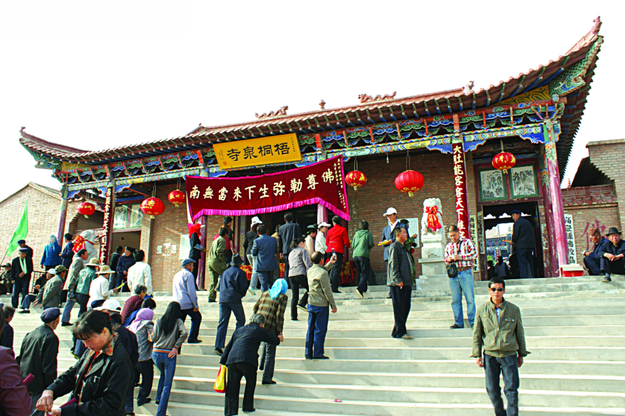 梧桐泉寺始建于明代嘉靖年間,位于高臺(tái)縣城西南榆木山西側(cè)山崖嶺坡之上,距縣城38公里,為佛道兩教活動(dòng)場(chǎng)所,因山澗有滴滴泉及梧桐樹而得名。每逢農(nóng)歷四月初八前后,適值春夏之交,游覽者絡(luò)繹不絕。梧桐泉香火旺盛,從四月初一開(kāi)始,信徒及群眾就已開(kāi)始前往寺中朝拜住宿,籌備浴佛節(jié)諸項(xiàng)事宜。四月初七晚戌時(shí),在寺內(nèi)舉辦放焰口儀式,誦《焰口經(jīng)》。四月初八辰時(shí)舉辦浴佛典禮,由住持從藏佛殿請(qǐng)出鎏金佛降生像,至大雄寶殿沐浴,置佛像于香湯盆內(nèi),住持先用浴勺沐浴三次,然后上香三拜,跪爐,宣疏畢,唱浴佛偈,再由受戒弟子、居士、群眾等依次浴佛。待當(dāng)日晚課禮佛后,將佛降生像送回藏佛殿。趕廟會(huì)時(shí),當(dāng)?shù)孛耖g流傳著“搶上第一炷香”的習(xí)俗,認(rèn)為四月八這天清晨第一個(gè)到梧桐泉寺焚香許的愿最靈驗(yàn)。由于香客眾多,帶去的盤貢十分充足,這天中午,寺內(nèi)還有專人在一兩個(gè)專設(shè)的窗口處散貢。寺后有泉源自山石縫隙中滲出,流淌成溪,香客及游覽者紛紛爭(zhēng)飲泉中之水,寺內(nèi)藥王廟中有一水井,井內(nèi)之水清冽無(wú)比,香客認(rèn)為與泉源相通,皆佛家圣水,亦取此井中之水飲用或帶回家中。高臺(tái)梧桐泉廟會(huì)的傳承人主要有高臺(tái)縣佛教協(xié)會(huì)會(huì)長(zhǎng)、梧桐泉寺寺管會(huì)主任、縣政協(xié)委員釋諦法。 2010年7月6日,高臺(tái)梧桐泉廟會(huì)被張掖市人民政府列入第二批張掖市非物質(zhì)文化遺產(chǎn)代表性項(xiàng)目名錄。保護(hù)單位:張掖市高臺(tái)縣文化館。