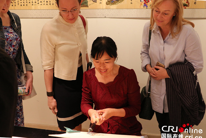 山丹縣非遺傳承人周玉梅在莫斯科中國文化中心現(xiàn)場展示烙畫制作工藝