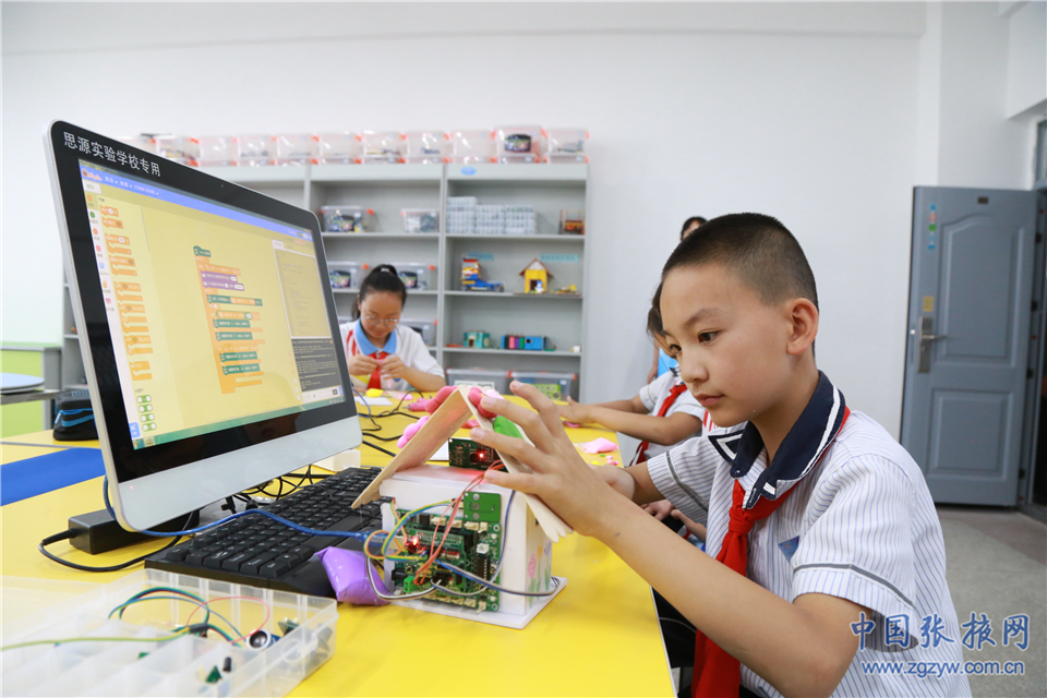 “短短4年時間,學校建成智慧教室10間,配備創客機器人套件56套、智能環保套裝10套、智能物聯網實驗包10套、人工智能機器人阿爾法套裝10套、3D打印機8臺、3D打印筆50余套,已實現交互式多媒體教學‘班班通’、計算機云教室全覆蓋,為引導學生在創造、分享過程中快樂成長和成才奠定了堅實基礎。學生參加國家及省市青少年科技創新大賽人數逐年翻番,已有100余名學生榮獲各類獎項,參賽獲獎率居全區之首。”學校黨委書記繆自軍如是介紹。