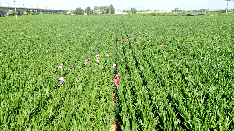 在宣威村種植大戶王重明的玉米地里人頭攢動,20多人正你拼我趕地勞作著。“今年玉米長勢好,我種了360畝的制種玉米,提前找好了人提早開始去雄工作,再有兩三天頭遍就結束了。”宣威村種植大戶王重明說道。