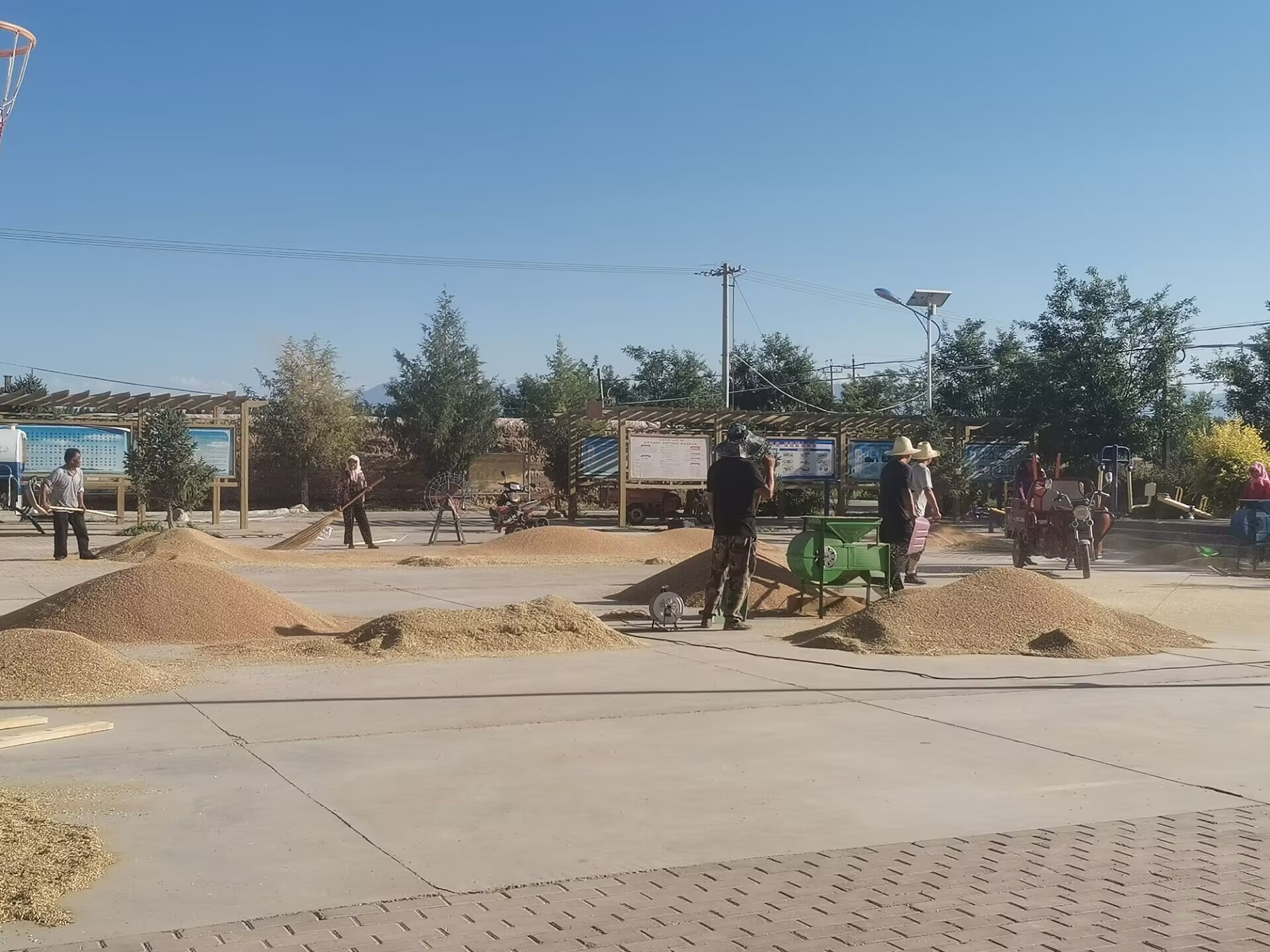 走進三三村文體廣場,村民宋克林正聯(lián)合街坊鄉(xiāng)鄰裝運完成晾曬的小麥為即將到來的“晾曬大軍”騰好曬場。在四壩村文體廣場,只見鄉(xiāng)村舞臺前的文體廣場上一片“金黃”,攤曬平整的小麥在“日光浴”中散發(fā)著陣陣清香,村干部季友兵介紹說,自文體廣場開放以來已有17戶村民在此晾曬糧食23000余斤。