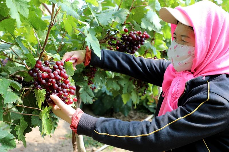 “我家葡萄從種植到掛果,施的是農(nóng)家肥。葡萄掛果時,為葡萄套上專用袋,使葡萄透氣又不被雨水沖刷,保證了果實甜度。”新華鎮(zhèn)向前村四社葡萄種植戶陳天兵介紹。向前村有近10余年的葡萄種植歷史,葡萄產(chǎn)業(yè)已成為該村發(fā)展經(jīng)濟的主導(dǎo)產(chǎn)業(yè)。葡萄品種大多以紅提為主,同時有陽光玫瑰、藍寶石等系列名優(yōu)新特品種,葡萄含糖量高,粒大皮薄、色艷肉厚,每逢葡萄成熟季節(jié),總有成群結(jié)隊的各地市民利用節(jié)假日驅(qū)車前往向前村,體驗采摘樂趣。今年,向前村積極謀劃,從良種優(yōu)選、基地施肥、后期管護、套裝種植等方面統(tǒng)一標(biāo)準(zhǔn)、嚴(yán)格把關(guān),達到無農(nóng)藥、無公害綠色生態(tài)水果要求,不斷放大葡萄經(jīng)濟效益,以實現(xiàn)既增產(chǎn)又增收,從而帶動更多老百姓走向致富之路,為全鎮(zhèn)鄉(xiāng)村振興增添活力。“葡萄的保鮮期不長,以前農(nóng)戶都擔(dān)心自家的葡萄放不了多久就會爛掉,現(xiàn)在我們聯(lián)系好了冷庫,來不及在保鮮期銷售出去的葡萄可以儲存在冷庫里。”向前村黨總支書記王正岳說。