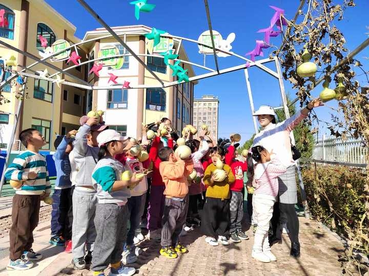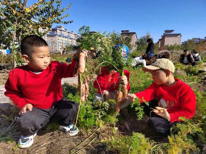 中國張掖網臨澤訊 近日,臨澤縣實驗幼兒園的種植園內一片熱火朝天的場面,孩子們在老師的帶領下分工合作,一根根胡蘿卜被紛紛拔起,一個個葫蘆被收獲一空……望著一大堆勞動成果,孩子們紅彤彤的小臉上洋溢著收獲的激動與喜悅。