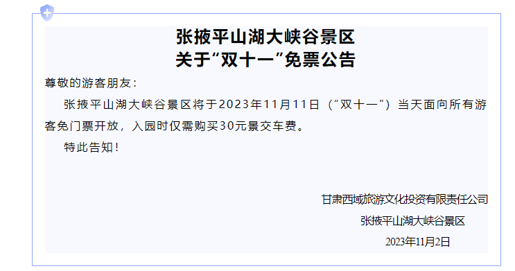 張掖平山湖大峽谷景區(qū)關(guān)于2023年“雙十一”免票公告