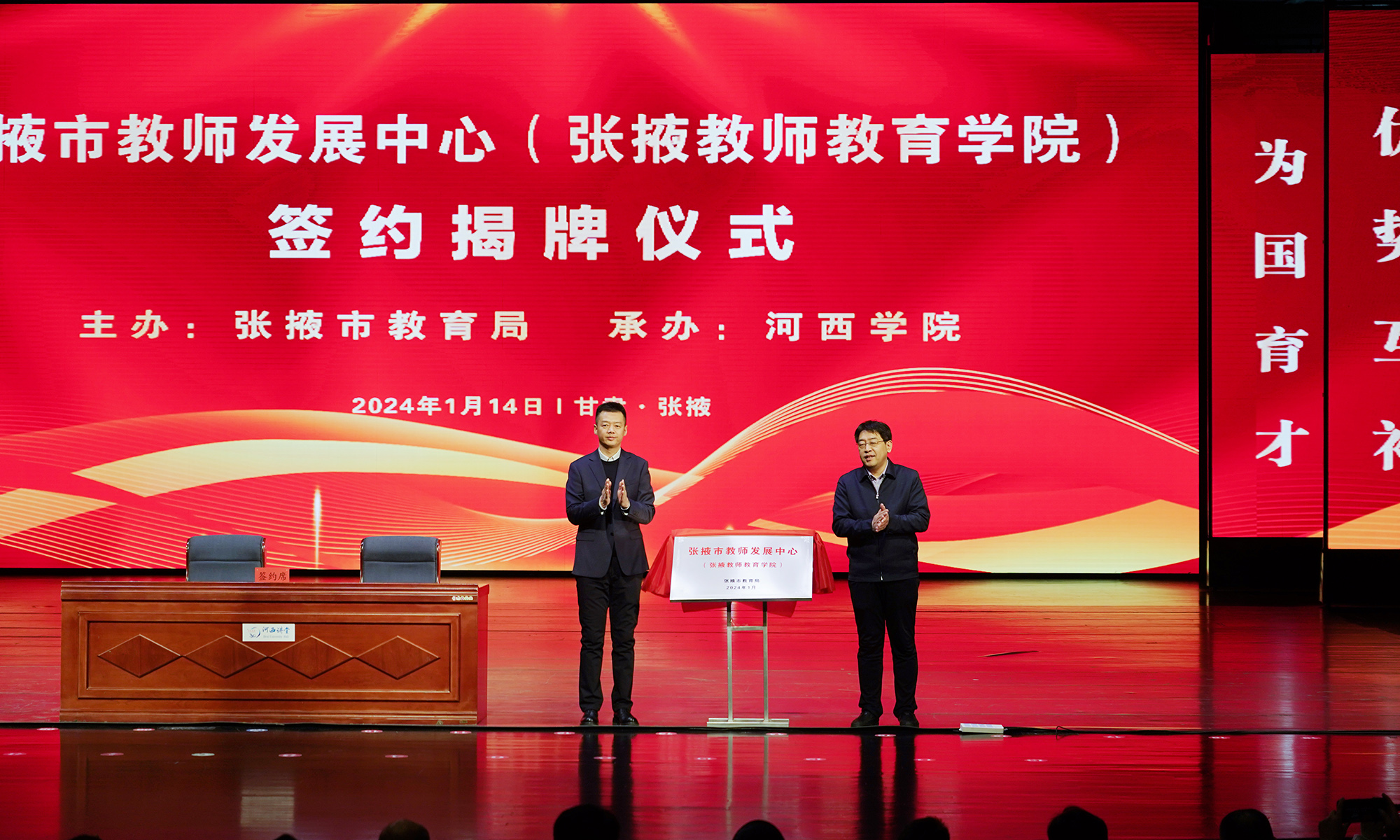 中國張掖網訊 1月14日,張掖市教師發展中心(張掖教師教育學院)簽約揭牌儀式暨2024年全市校園長管理能力提升研訓班在河西學院河西講堂報告廳舉辦。河西學院黨委常委、副院長王新華、張掖市政府督察專員袁小龍出席,揭牌儀式由張掖市教育局黨組成員、副局長沈玉祿主持。