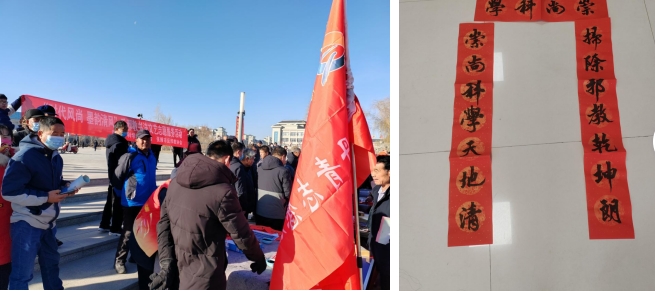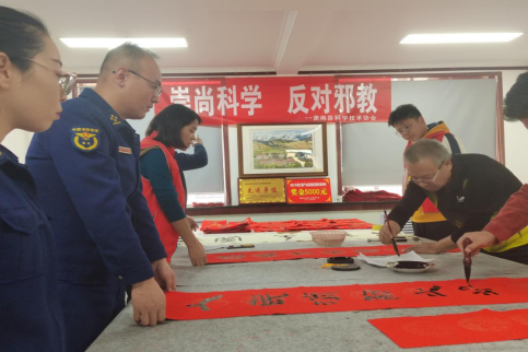 山丹縣科協會同縣文聯及書法家協會來到位奇鎮蘆堡村開展“崇尚科學,反對邪教,引領時代風尚,書寫墨韻清風”為主題的送春聯反邪教宣傳活動。本次活動撰寫反邪教春聯30余對,發放反邪教宣傳資料100余份,不僅讓轄區的居民感受到了暖暖的年味,還極大地提高了廣大居民群眾防邪、反邪意識,更好的引導和教育群眾掌握反邪教知識,發動居民群眾積極參與到反邪教宣傳的隊伍中來,營造了“講科學、反邪教”的良好風氣,有力推動美麗鄉鎮平安建設。