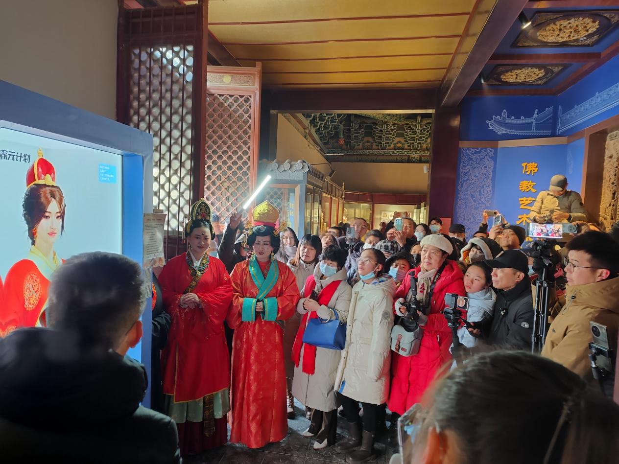 同時,一場精彩的絲綢之路古民族服飾展演在藝術展廳前開始,講解員身著回鶻、黨項、裕固族等民族服飾,生動再現了古代民族服飾之美。講解老師向觀眾們介紹絲綢之路古民族的服飾特點、藝術元素、歷史背景,讓大家了解民族服飾的演變與歷史文化的傳承。在講解老師的引導下,讓現場的觀眾體驗絲路民族服飾虛擬穿衣互動系統。該系統讓觀眾生成民族服裝的虛擬試穿立體效果,還可在張掖大佛寺景區公眾號內置的“數字探元”小程序中回看、保存自己穿著黨項、回鶻、裕固等絲路民族服飾的形象,在手機上實時交互體驗。