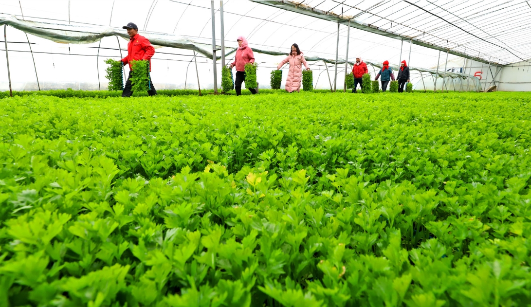 5號大棚里綠意融融,一株株花卉苗破土而土,一個個綠色的“小腦袋”從深褐色的基質(zhì)盤中探出來,散開兩片或三片的小綠葉,管護人員挨排灑水。掀開4號棚的門擋,滿眼翠綠映入眼簾,20公分高的芹菜葉大苗壯,長勢喜人,傳遞著“春”的氣息。“5號棚培育一串紅、夏日草等花卉2000盤。4號棚培育芹菜苗2500盤,計劃4月出苗。現(xiàn)在進行殺蟲、滅菌、施肥等管護作業(yè),出苗前需‘平茬’,平到10公分左右,機械‘平茬’一天一棚,人工的話稍慢些,得一盤盤用剪刀剪。”高臺縣新優(yōu)高科生態(tài)田園專業(yè)合作社辦公室人員黃志鳳介紹說。
