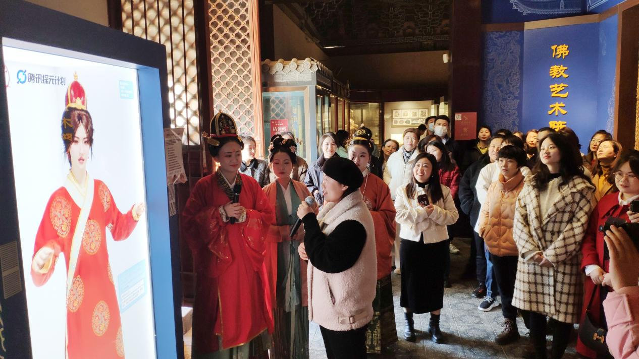 “云灼公主”邀請體驗民族女性服飾。當張掖大佛寺景區數字IP推薦官云灼公主,在大屏幕中向女性朋友們送去婦女節的祝福后,工作人員裝扮的真人版“云灼公主”從數字虛擬人旁邊走了出來,邀請活動參與者來到張掖大佛寺文物研究所精心打造的絲路古代民族服飾虛擬換裝互動系統前,開始了一場古代民族女性服飾體驗秀。在這套系統中,存有黨項、回鶻、裕固等絲路民族的服飾,可以通過現場人臉識別,選擇喜歡的民族服飾,即可形成栩栩如生的個人數字形象,充分感受古代民族女性服飾之美。這種真實與虛擬的穿插互動,個人與數字的完美結合,科技加文化的場景應用,讓絲綢之路古代民族文化遺產煥發出新的生機與活力。