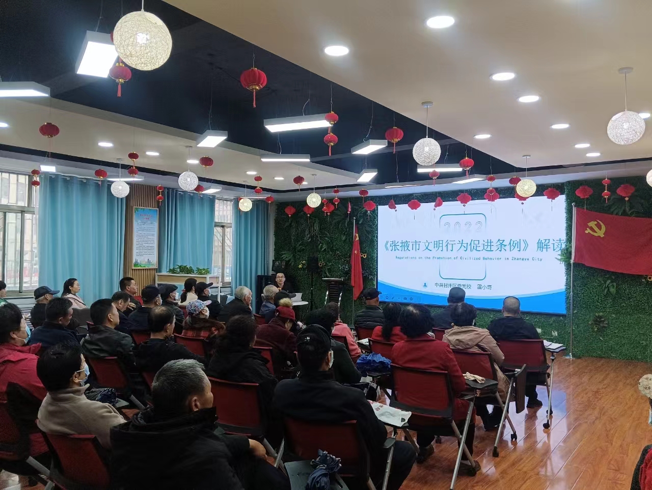 活動邀請到區委黨校講師對《張掖市文明行為促進條例》進行詳細解讀。《張掖市文明行為促進條例》的實施,標志著張掖市文明行為促進工作進入了法治化、規范化的新階段。《條例》倡導熱愛祖國、保護環境、愛崗敬業、文明上網、鼓勵見義勇為、志愿服務、無償獻血等文明行為。通過老師的精彩解讀,引導黨員同志們作為城市大家庭的一員,都有責任、有義務通過自己的文明行為為城市增色添彩。此次活動的開展,進一步提高了《張掖市文明行為促進條例》的知曉率,以點帶面,從而帶動和引導更多的群眾自覺遵守社會公德,恪守職業道德,弘揚家庭美德,提升個人品德,爭做文明行為的踐行者、文明風尚的傳播者,真正做到全民參與創建文明城市。(龐菁)