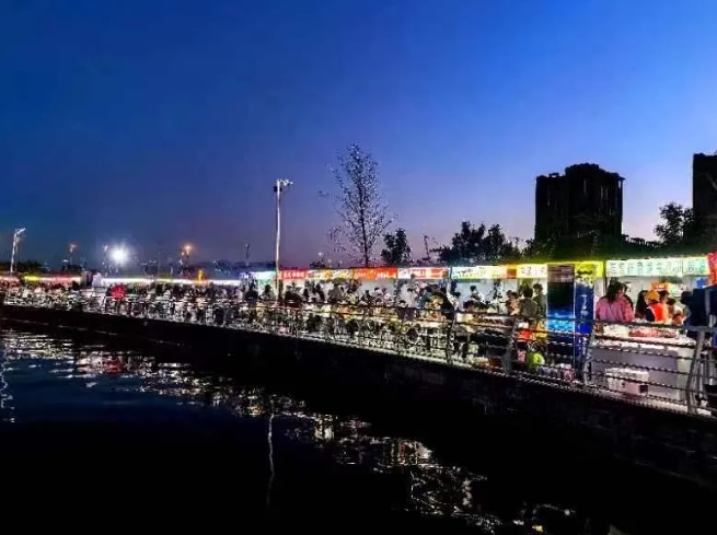 在夜市的熱鬧氛圍中,各類人群匯聚一堂。年輕的情侶手挽手漫步在人群中,不時地交談著,臉上洋溢著幸福的笑容。家長們帶著孩子穿梭在攤位間,品嘗著各種美食,享受著難得的親子時光。還有那些三五成群的年輕人,他們在皓月橋下,圍坐在攤位前,如同李白“舉杯邀月”般,與同伴暢飲,暢談人生理想。