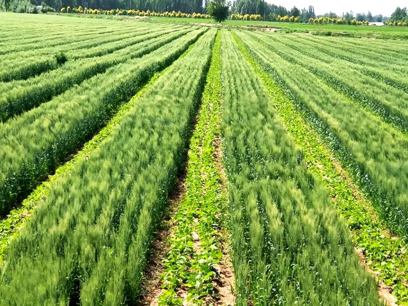 初夏時節,臨澤縣蓼泉鎮上莊麥田里,麥苗孕穗揚花,迎風搖曳,長勢喜人。放眼望去,每隔幾行麥苗間,都規律穿插著一壟壟嫩綠的大豆,在陽光照射下構成一幅黃綠相間的田園畫卷……