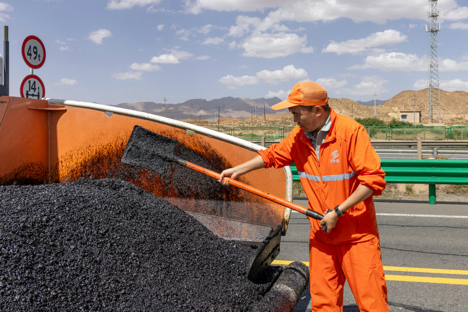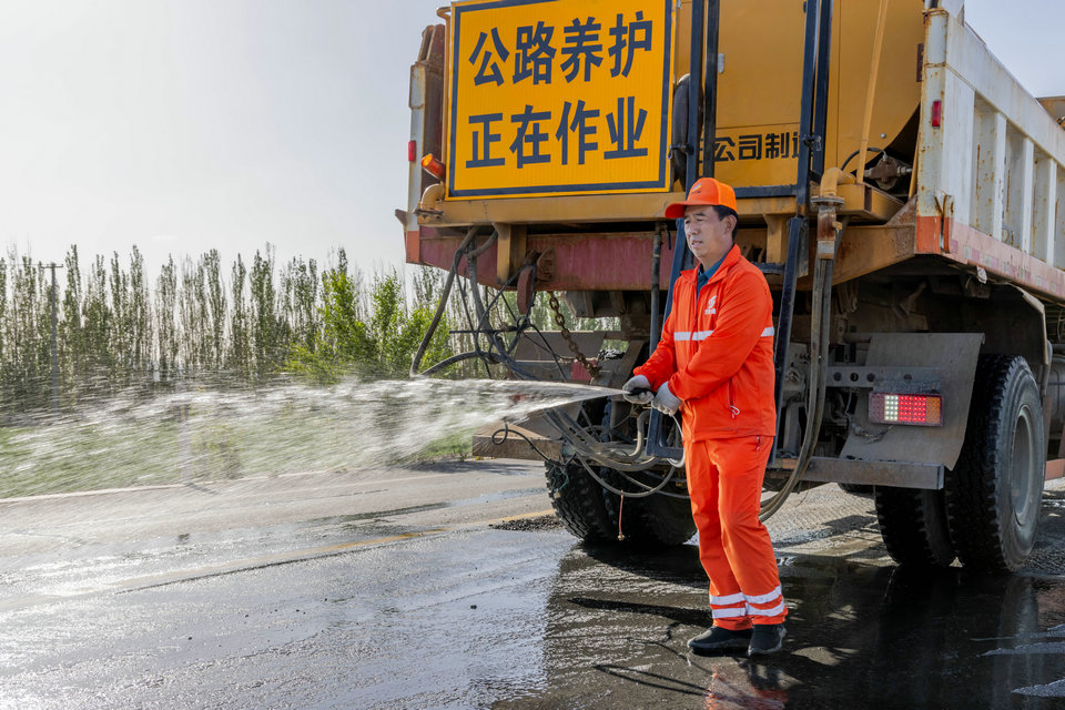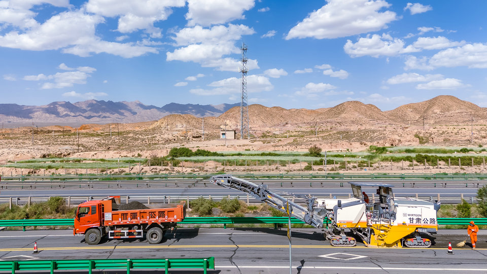 中國張掖網山丹訊 6月4日,在山丹縣境內的國道312線上,張掖公路事業發展中心山丹公路段組織開展公路巡查保潔、路面病害銑刨、油路修補、橋梁日常養護等工作,切實延長公路使用壽命,提升道路通行效率。(張嘯天)