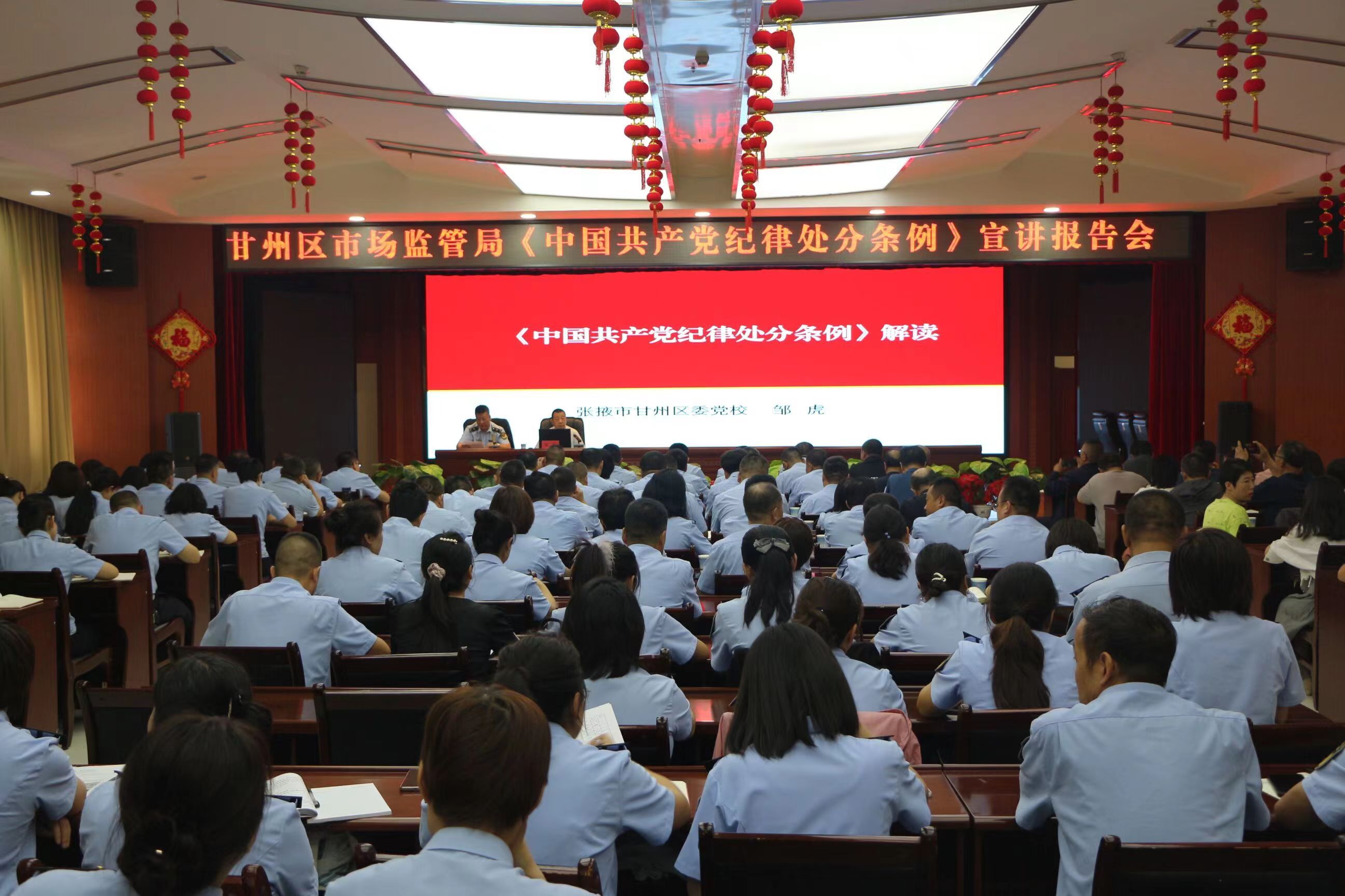 中國張掖網(wǎng)甘州訊 為引導廣大黨員干部進一步學紀、知紀、明紀、守紀,近日,甘州區(qū)市場監(jiān)管局邀請區(qū)委黨校教授對《中國共產(chǎn)黨紀律處分條例》進行了專題宣講解讀。區(qū)發(fā)展改革局、區(qū)商務(wù)局、區(qū)稅務(wù)局、區(qū)工信局、區(qū)審計局領(lǐng)導干部及職工代表;市場監(jiān)管局機關(guān)、各監(jiān)管所干部職工,共計160余人參加了宣講報告會。