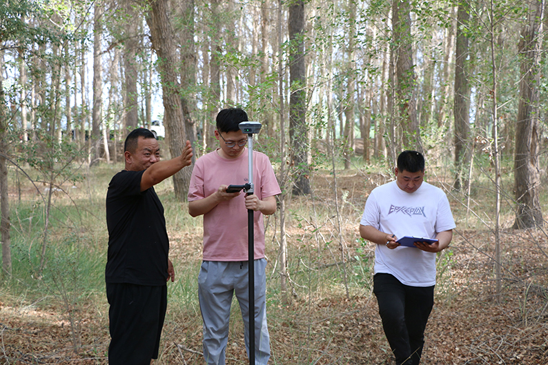 勘測(cè)現(xiàn)場(chǎng)正在帶隊(duì)進(jìn)行實(shí)地勘測(cè)的張掖市指南針測(cè)繪有限責(zé)任公司總經(jīng)理許棟為了保證數(shù)據(jù)的精度,運(yùn)用了多種手段,他說:“為了保證數(shù)據(jù)的精度,我們以航拍信息為依據(jù),通過衛(wèi)星定位、人工測(cè)繪等方式進(jìn)行地籍勘測(cè),查清承包地塊實(shí)際面積、四至邊界和空間位置,最終實(shí)現(xiàn)每塊土地都有一個(gè)數(shù)據(jù)準(zhǔn)確的坐標(biāo)。”作為推動(dòng)集體林權(quán)制度改革具體工作的一員,臨澤縣自然資源局干部閆天虎說:“2009年集體林權(quán)改革時(shí),分林到戶的林地存在面積不準(zhǔn)、地類重疊、界線不清等問題,通過深化集體林權(quán)制度改革,理清了以上歷史遺留問題,解決了林地就是林地,耕地就是耕地,草地就是草地的根本問題。”