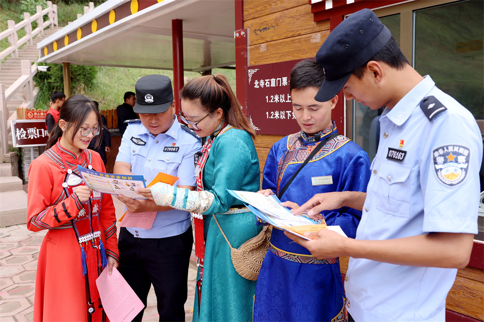 中國張掖網訊 “路上有交警及時疏導交通;景點隨處有警察值守,附近就有警車;景區棧道時時有警察巡邏、安全勸導……看到這一抹‘藍色’,我們心里就有滿滿的安全感。”來自重慶的游客王女士在肅南縣馬蹄寺旅游景區游玩時感嘆道。