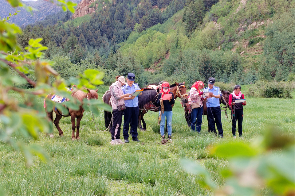 隨著暑期的到來,肅南縣馬蹄寺旅游景區旅游人數成倍增長,為做好景區“服務+護游”警務工作,肅南縣公安局馬蹄派出所秉持“游客不下山,警務不打烊”的理念,成立“景區小分隊”,民輔警來回穿梭在千佛洞、三十三天石窟、格薩爾王殿、停車場及串聯各個景點的交通道路上,時而“疏導保暢”,時而“排憂解難”,同時開展保護生態資源宣傳,當好巡護員、戰斗員、安全員、救助員、宣傳員,擦亮“生態旅游警務”、“平安旅游”名片,展示張掖公安良好形象。