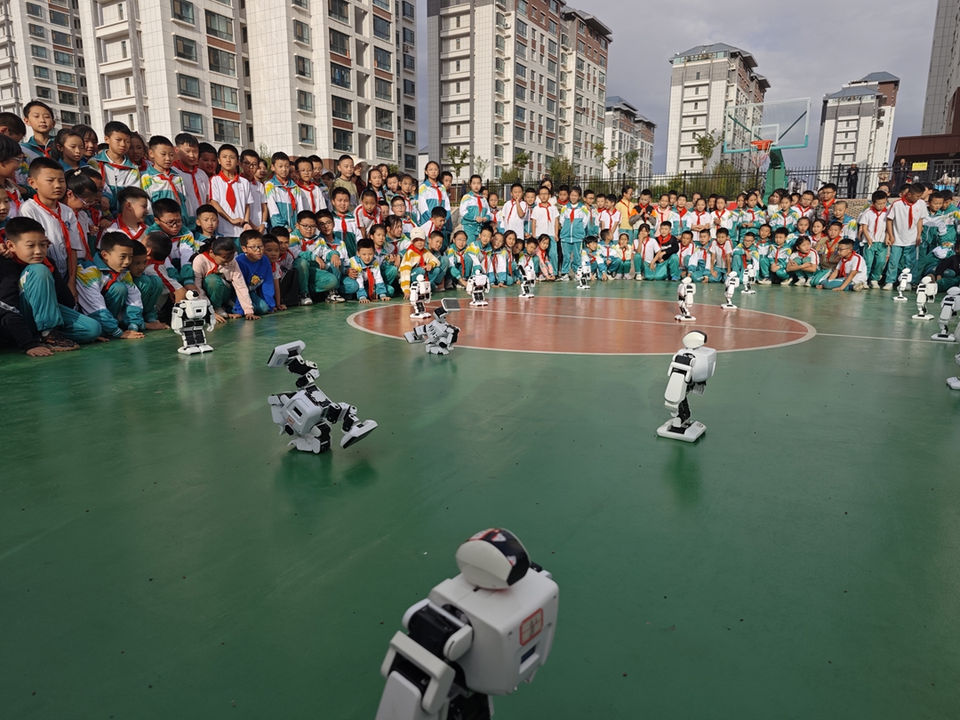 在學校操場,專家團隊成員還為學生們準備了精彩的機器人表演和航模飛行表演。機器人“優雅”的舞姿和俯臥撐展示吸引學生們爭先恐后的模仿和挑戰比拼,機器人靈敏的動作,引發孩子們的陣陣驚嘆,歡笑聲不斷。騰空而起的航模將現場氣氛推向高潮,各式的航模在空中翻滾旋轉,表演高難度動作,近距離沖擊著學生們的眼和心,讓學生們在全程歡呼的過程中真切感受到了科技的神奇和力量。