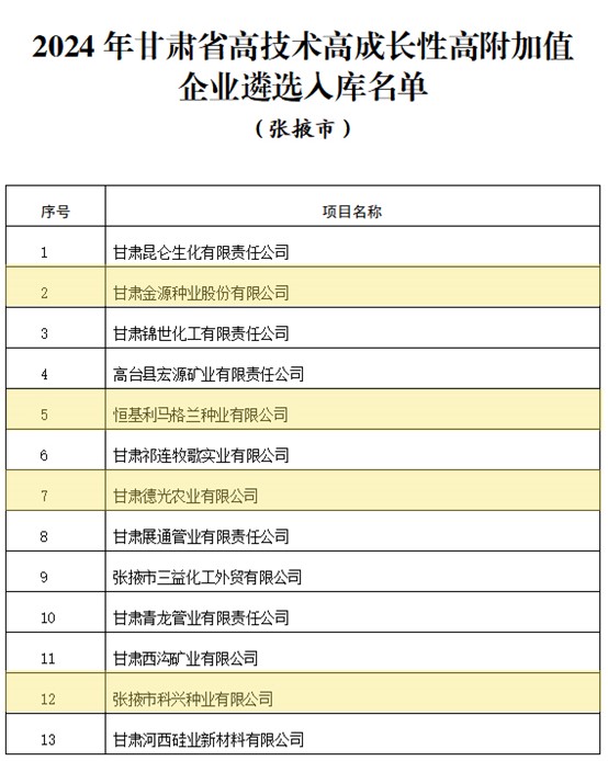 中國張掖網訊 近日,甘肅省科技廳發布了《關于對2024年甘肅省高技術高成長性高附加值企業遴選入庫的公示》,張掖市金源、恒基利馬格蘭、德光、科興4家種子企業進入公示名單。