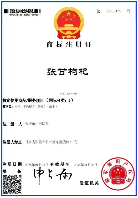 中國張掖網訊 近日,張掖市中醫醫院申報的“張甘枸杞”商標,被國家知識產權局正式核準注冊。