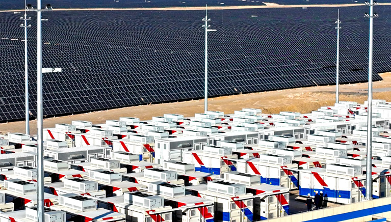 中國張掖網訊 日前,山丹縣東樂北灘百萬千瓦級光伏發電基地上,50MW/200MWH中帛源全釩液流儲能項目建成投入使用,開啟儲電模式,200套集裝箱、400個儲液罐組成的大型“充電寶”矗立在光伏集陣中,為電網穩定運行注入新動力。