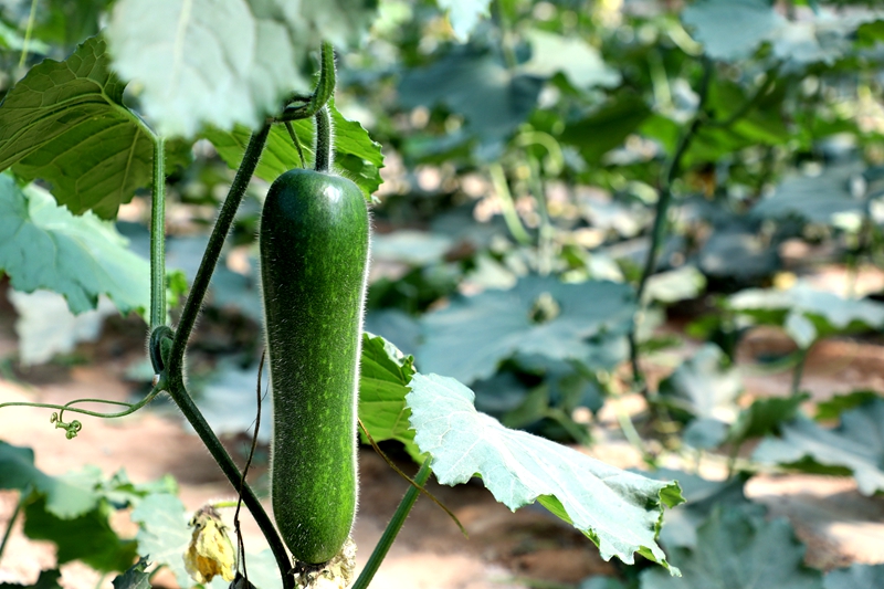 黑皮冬瓜口感爽脆、味道清淡,有清熱、利水、消腫的功效。倪家營鎮(zhèn)汪家墩采用“吊種+膜下灌溉”相結(jié)合的立體套種模式,最大限度利用空間,避免冬瓜與地面接觸,減少病蟲害,栽培出來的冬瓜瓜形優(yōu)、個頭大、肉質(zhì)敦厚,深受市場青睞。