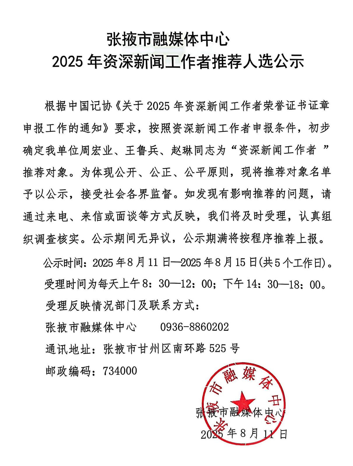 張掖市融媒體中心2025年資深新聞工作者推薦人選公示