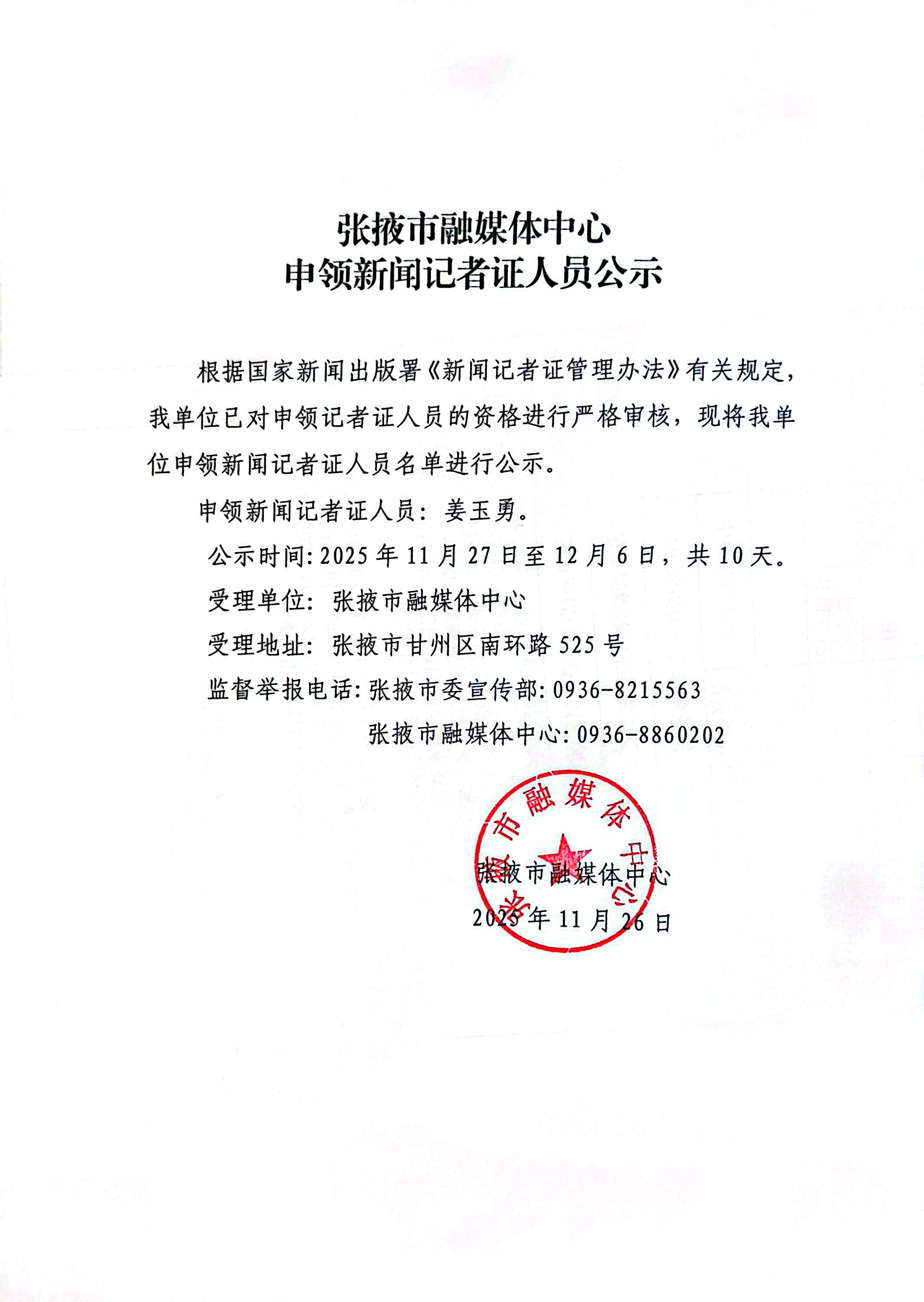 張掖市融媒體中心申領(lǐng)新聞記者證人員公示